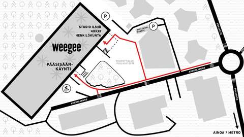 Coming to WeeGee using public transport is easy. The Tapiola metro station is about a 10-minute walk away from WeeGee. Buses 111, 113, 548 and 549, as well as local buses 116 and 119, come to the intersection of Ahertajantie and Pohjantie at the stop “WeeGee”. The nearest city bike station is located in the vicinity of the Exhibition Centre WeeGee on Ahertajantie. Check the availability of bikes on the HSL website(external link, opens in a new window).