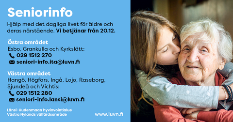 - The Senior Info counselling service of Western Uusimaa launches on December 20th 2022. Please note that, after this, the municipalities’ current customer service numbers for the elderly will no longer be in use!