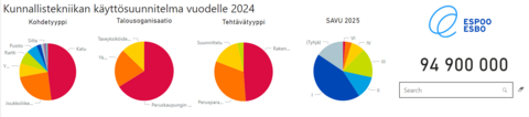 The report includes filters that can be activated by clicking on them. They allow you to examine Espoo’s infrastructure construction plans for 2024 by area or activity.