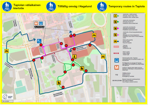 The construction of the concrete deck and its foundations continues on Itätuulenkuja. Due to the construction work, some temporary access bridges on the deck level will be removed between Sammonsilta and Itätuulenkuja 3. The direct pedestrian access from the street level on Itätuulenkuja near the Tuulimäki street to the Ainoa shopping centre and to the metro and bus terminal is also temporarily closed. Pedestrians can access Ainoa through the new bridge ramp or the deck level. At the western end of Itätuulenkuja, the route from the Omnia building towards Sammonsilta is also still available through the wooden bridge.