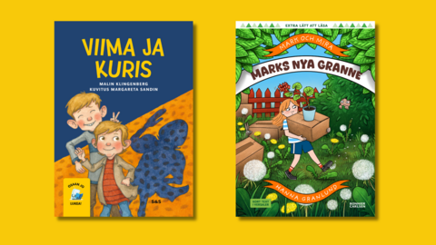 This year, the Finnish-language book gift for the first grade campaign is Viima ja Kuris (Vim och Galonis), written by Malin Klingenberg and illustrated by Margareta Sandin, translated to Finnish for the campaign by Outi Menna. The book is published by Kustantamo S&S.
