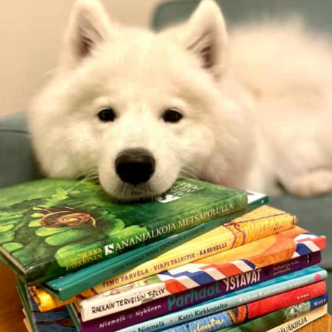 Halla on 1-vuotias samojedinkoira. Halla vierailee Lippulaivan kirjastossa.
