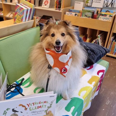 Freia on 8-vuotias shetlanninlammaskoira. Freia vierailee Laajalahden kirjastossa.