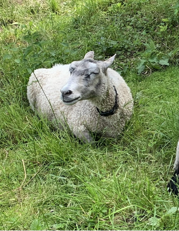 Jag är fåret Bertta och tog sommaren 2025 hand om ängslandskapet på museiområdet vid Pentala skärgårdsmuseum tillsammans med fyra andra får. På den här bilden vilar jag och doftar gräs. Jag är ett viktigt djur, för jag ger ull som man kan göra varma kläder av.