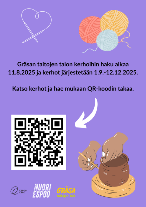 Gräsa är ungdomars hobbyplats för hantverksfärdigheter i Olarsbäcken i Esbo. Hos oss kan du lära dig en mängd olika hantverksfärdigheter från nybörjarnivå och tillbringa din fritid i en kreativ atmosfär.