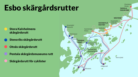 Skärdgårdsbåtarna trafikerar under sommarsäsongen. Med skärgårdsbåtarna kan man ta sig till fem friluftsöar: Stora Kalvholmen, Pentala, Gåsgrund, Rövaren och Stora Herrö. Långa skärgårdsrutter startar från Stensvik och Otnäs. Till Stora Kalvholmen trafikeras korta rutter från Finno, Gäddvik och Nokkala. Till Pentala Skärgårdsmuseum trafikeras rutter från Finno, Svinösunden och Sökö. Skärgårdsrutt för cyklister går runt Sommaröarna, men stannar inte vid öarna.