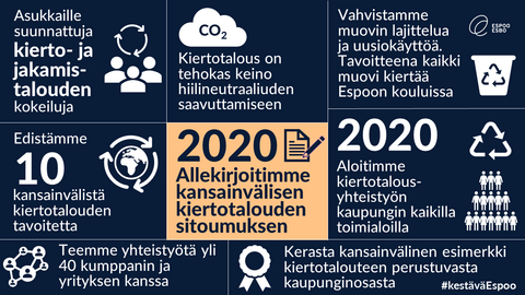 I slutet av 2020 undertecknade stadsdirektör Jukka Mäkelä den europeiska förbindelsen Circular Cities Declaration med vilken Esbo förbinder sig till de gemensamma målen för cirkulär ekonomi. De tio målen i förbindelsen främjar genomförandet av cirkulär ekonomi och hållbar utveckling i staden. Vi har förbundit oss till att skapa en tydlig plan för cirkulär ekonomi genom att bygga en vägkarta för cirkulära ekonomi, öka medvetenheten om och engagemanget i cirkulär ekonomi och att ta den cirkulära ekonomin till såväl all verksamhet i staden som det hur affärsverksamheten kring cirkulär ekonomi stärks i Esbo.