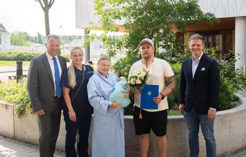 Onsdagen den 29 juni besökte stadsdirektör Jukka Mäkelä och stadsstyrelsens ordförande Henrik Vuornos Esbo sjukhus för att gratulera en nyfödd Esbobo.