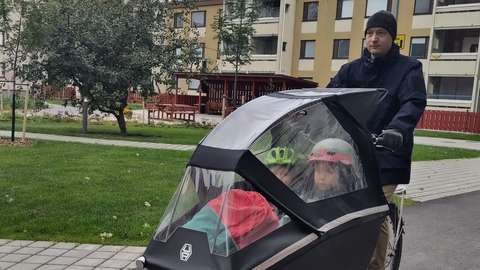 ”Barnen gillar att sitta på cykeln med förlängd pakethållare, och i kallt väder skyddar lådcykelns sufflett mot snålblåsten”, berättar Tomi Hukkalainen.