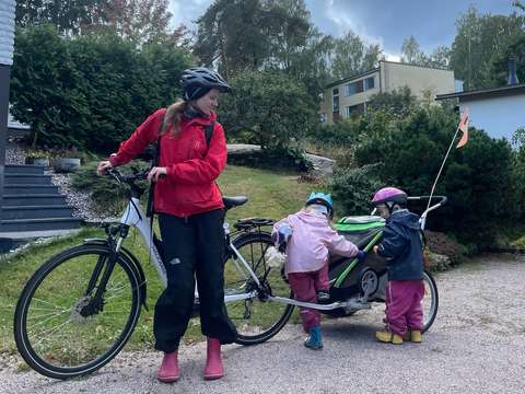 För Suvi Sippo i Gröndal är cykling det huvudsakliga sättet att ta sig från en plats till en annan. ”Jag tycker om att cykla, men jag vill också ta mig fram på ett hållbart sätt”, säger Sippo. Med cykeln kommer familjens tre- och femåriga barn till dagis och mamman till jobbet i Alberga.