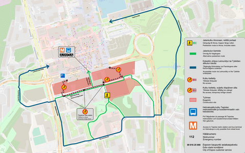 Esbo stad har som mål att ta i bruk den nya tillfälliga träbron över Östanvindsgränden och den nya tillfälliga förbindelsen på marknivå i augusti. Genomförandet av bestående trafikförbindelser påskyndas också.