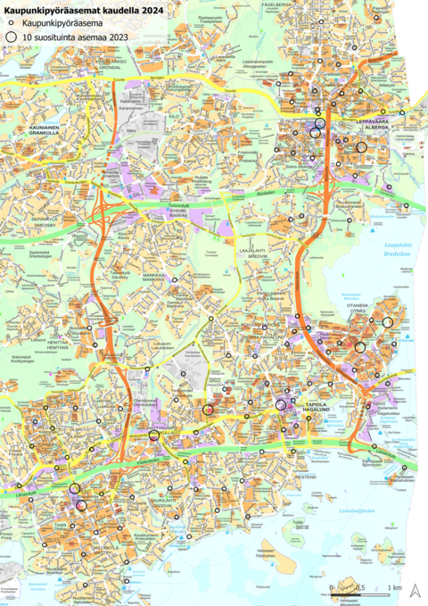 De populäraste stadscykelstationerna i Esbo ligger vid metrostationerna och Alberga tågstation