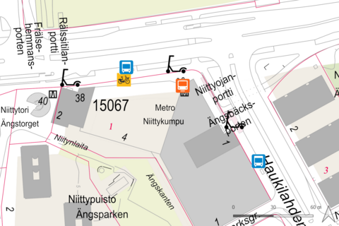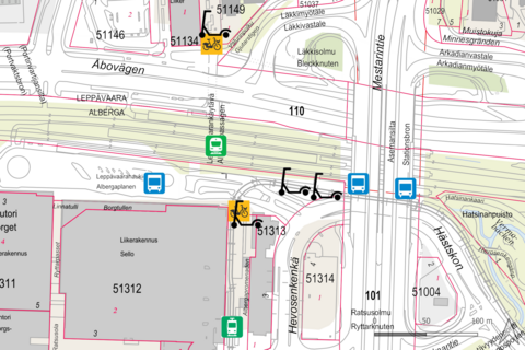I juli uppmärktes sammanlagt 21 stycken nya riktgivande parkeringsplatser för elsparkcyklar. Av dessa ligger en vid Idrottsparkens metrostation, fyra vid Ängskulla metrostation och köpcentret Niitty, tolv i Mattby i närheten av Iso Omena, främst på Biskopshemmansvägen och i anslutning till cykelparkeringarna vid kollektivtrafikens anslutningsparkering, samt fyra stycken i närheten av Spårjokerns hållplats och tågstationen i Alberga. Därutöver finns det parkeringsplatser vid stombusslinjernas hållplatser. Du ser de exakta platserna för de parkeringsplatser som märktes upp i juli på kartorna.