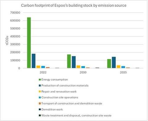 Enligt det nya scenariearbetet står energin för den mest betydande andelen av klimatavtrycket från Esbos byggnadsbestånd fram till år 2030. Genom Esbo stads nuvarande åtgärder för klimatneutralitet blir utsläppen från tillverkning av byggmaterial större än utsläppen från energianvändning efter år 2030. Utsläppen av byggnadsbeståndets material, som framför allt består av tillverkning av stål och betong, beräknas vara 183 kt CO2e år 2022, 151 kt år 2030 och 143 kt år 2035. Bild 2 visar vad klimatavtrycket från Esbos byggnadsbestånd består av år 2022, år 2030 och år 2035.