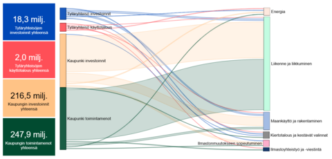 Bild 1. Den ekonomiska sammanställningen av klimatarbetet 2025 lyfter ur stadens budget fram de verksamhetskostnader och investeringar som stadsorganisationen och dottersammanslutningarna allokerar till klimatarbete.
