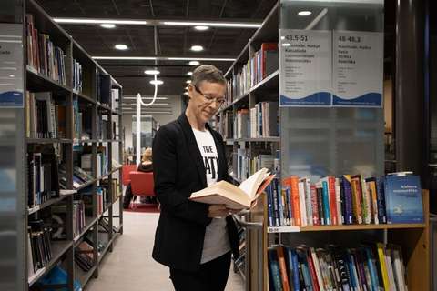 Ritva Nyberg har lett bibliotekstjänsterna i Esbo i fyra år och har hunnit med allt möjligt! Hon har erfarenhet från biblioteksbranschen från såväl Lahtis, Vanda som Windhoek och reste i unga år runt i Europa med sitt eget band.