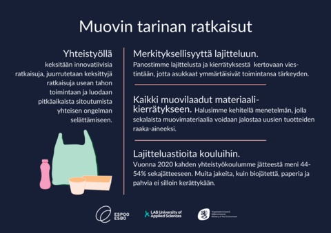 Plastens berättelse – från skräp till produkt är Esbo stads och Yrkeshögskolan LAB:s gemensamma projekt som har fått finansiering från miljöministeriets försöks- och pilotprojekt för färdplanen för plast. Projektet startade i början av 2021 och fortsättade till slutet av september 2022.